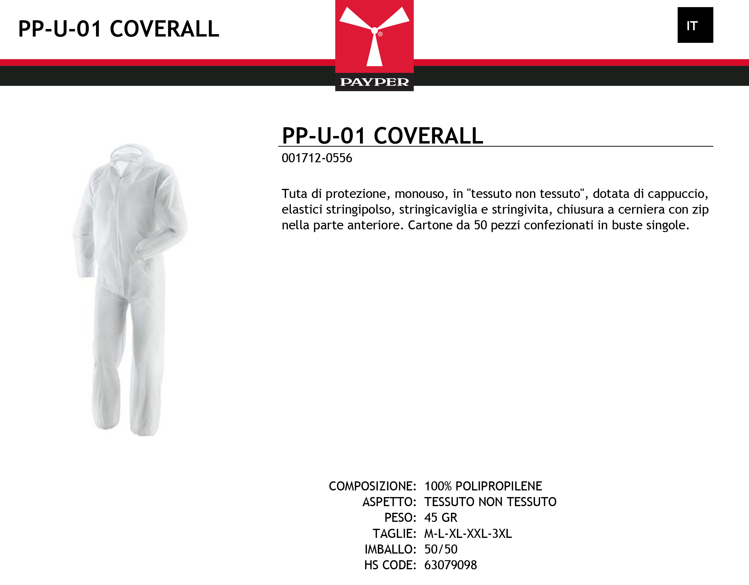 Tuta di protezione, monouso, in "tessuto non tessuto", dotata di cappuccio, elastici stringipolso, stringicaviglia e stringivita, chiusura a cerniera con zip nella parte anteriore