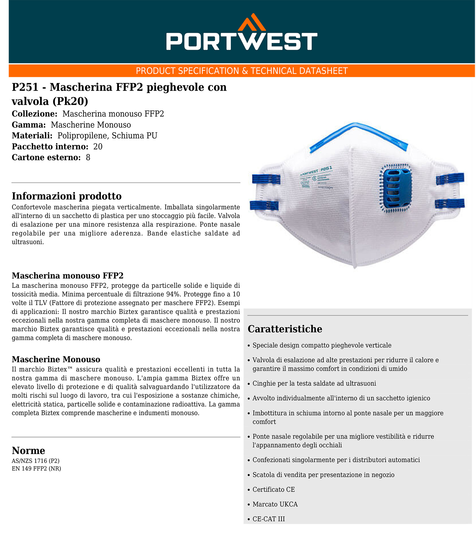 Mascherina pieghevole verticale progettata per offrire un elevato comfort. È confezionata singolarmente in un sacchetto di plastica, così da facilitarne lo stoccaggio. La valvola di esalazione riduce la resistenza respiratoria, mentre il ponte nasale regolabile assicura una migliore aderenza al viso. Le bande elastiche, saldate a ultrasuoni, garantiscono una tenuta stabile e confortevole.